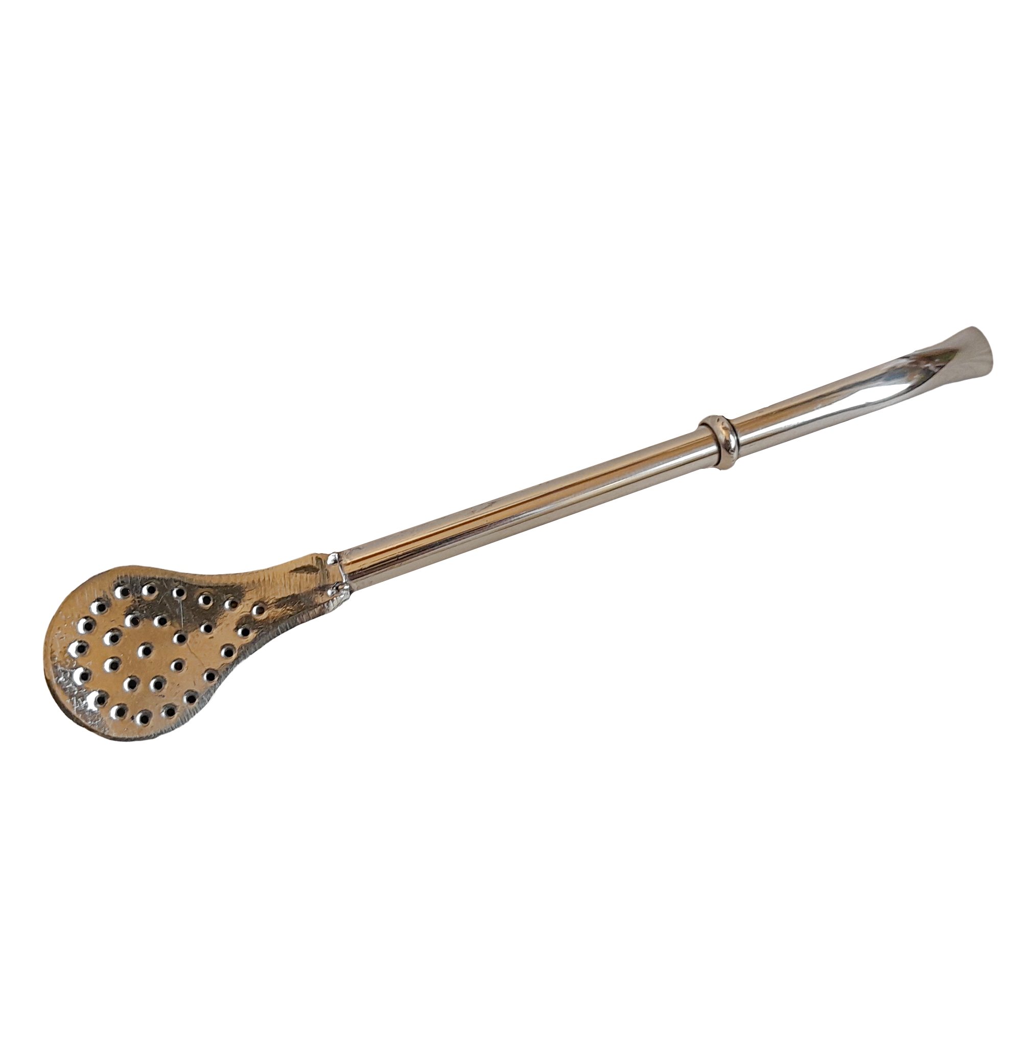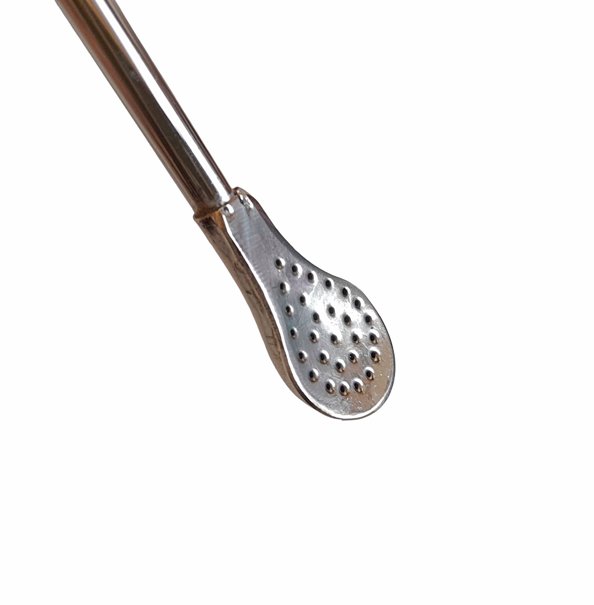 Most straws (bombilla) are made either of metal, bamboo or cane. These bombillas or straws have a fine filter at the rear end (small holes). This is the side of the bombilla / straw that is inserted into the mate. The bombilla / straw works like a tea bag for regular tea, as it keeps any fibrous material from being mixed with the liquid that you suck when using it.