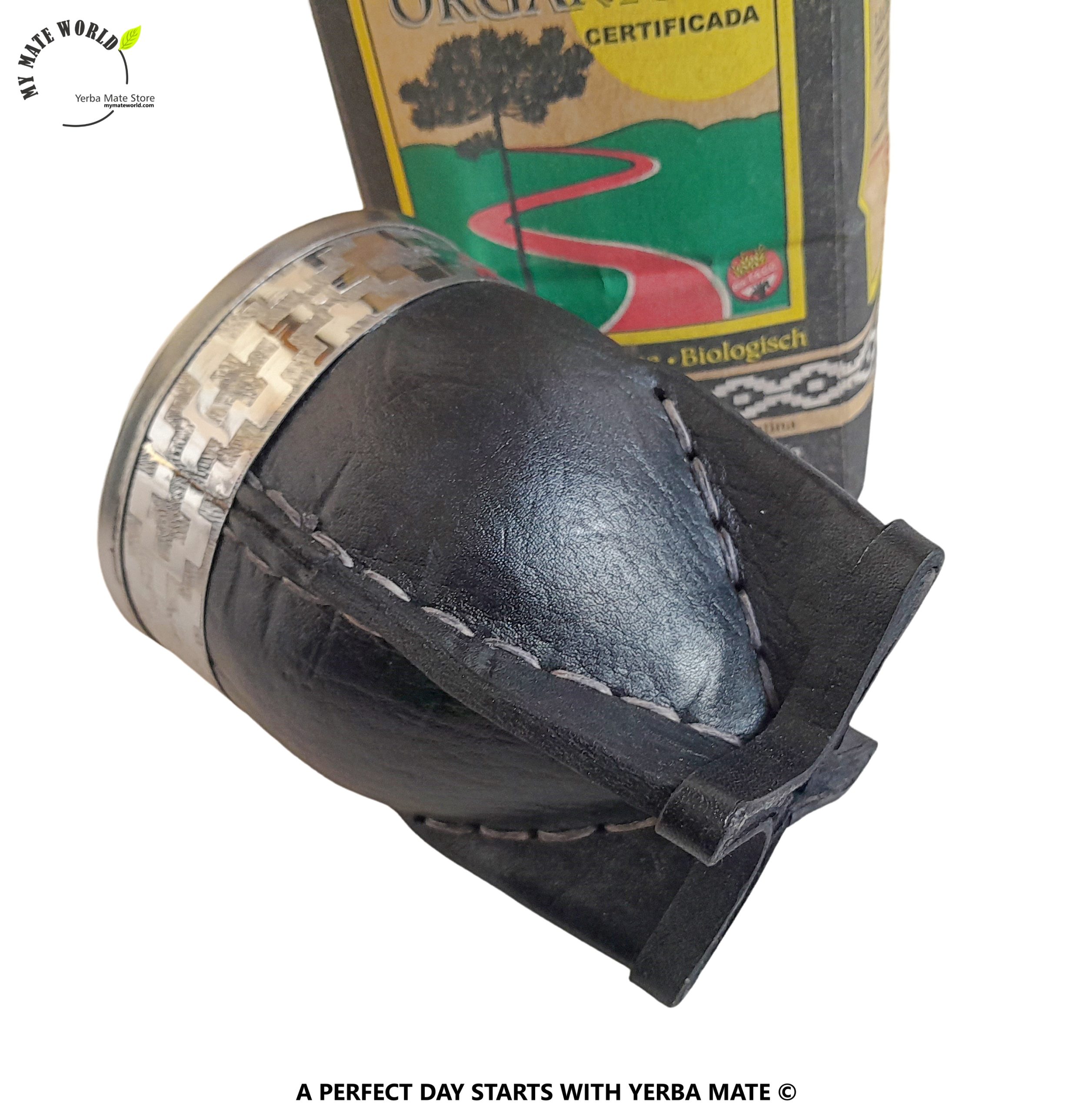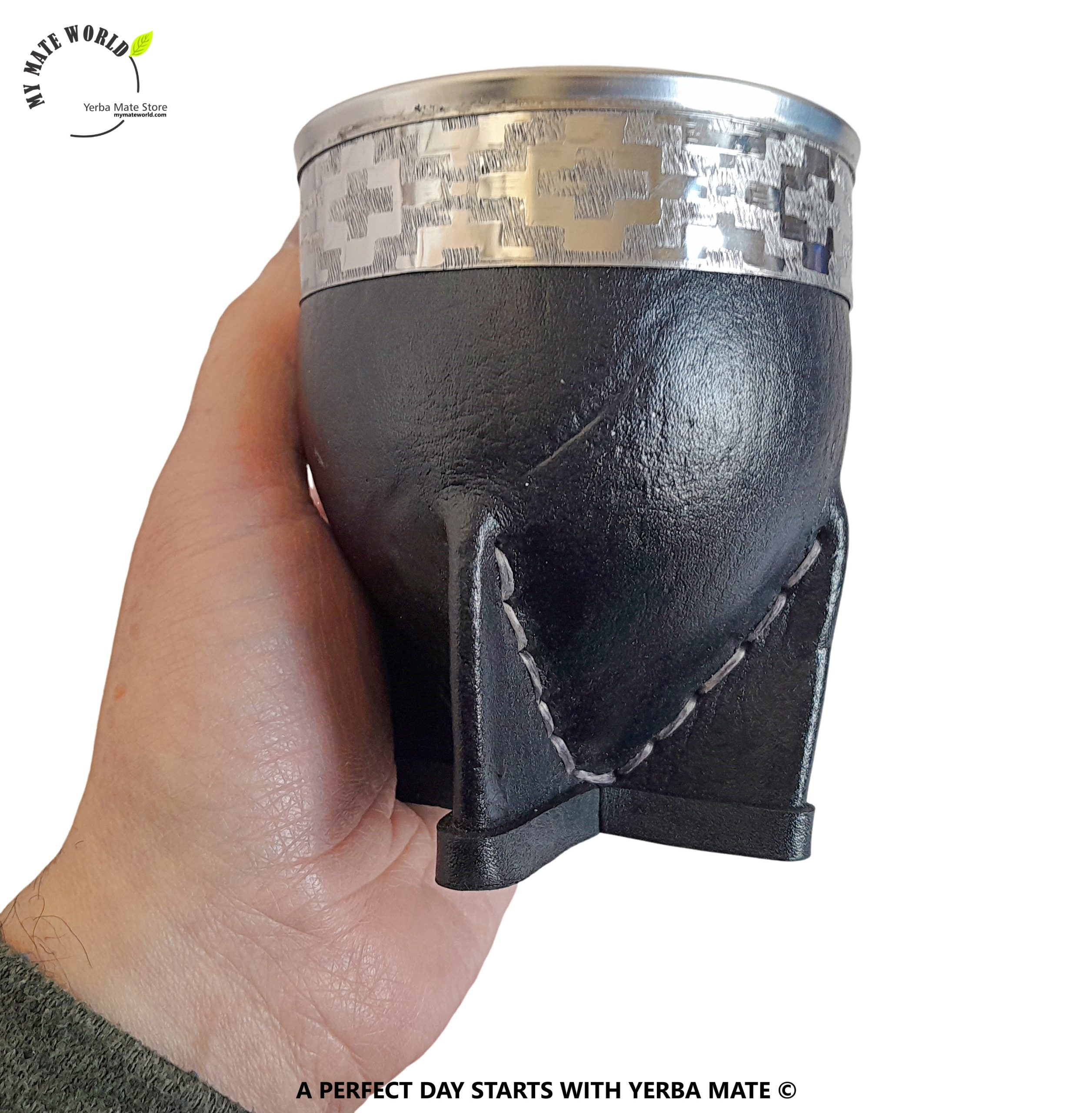 1 Beautiful “Imperial” Style Yerba Mate Gourd Covered With Black Leather & Stainless Steel “Guarda Pampa” Rim