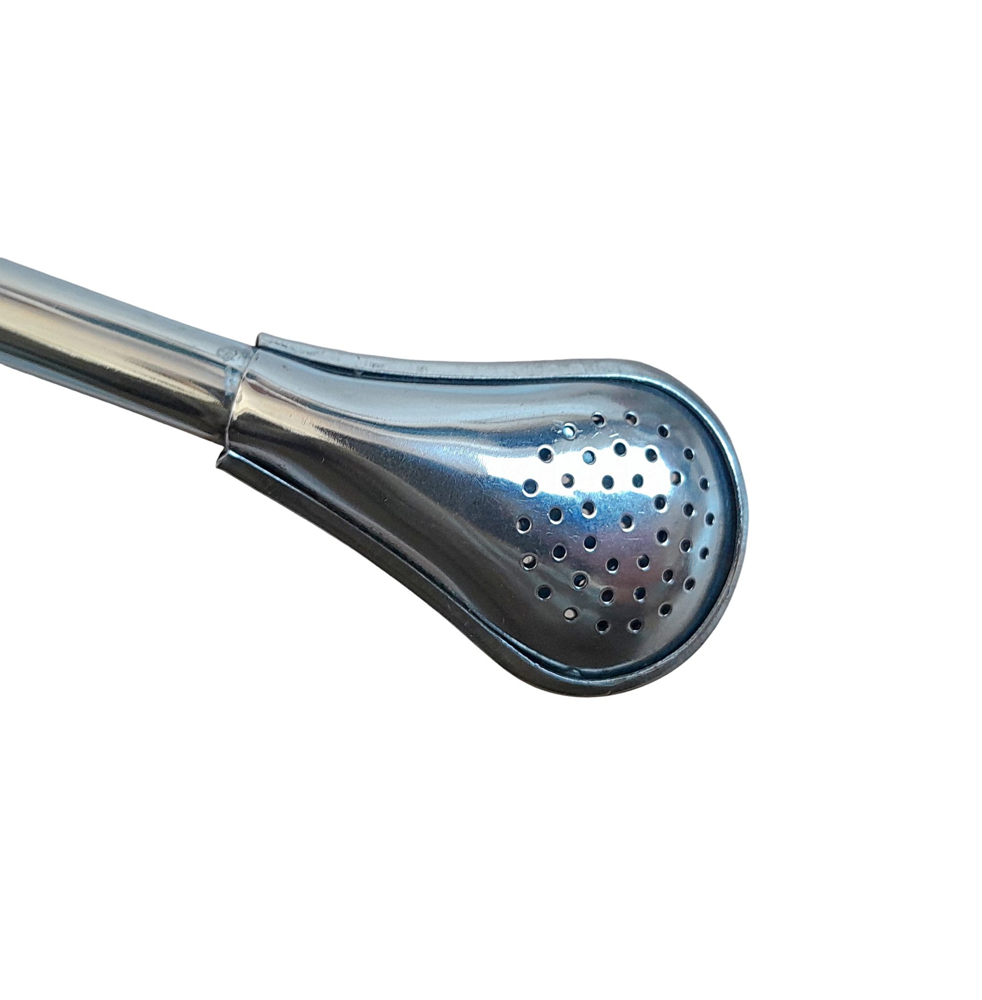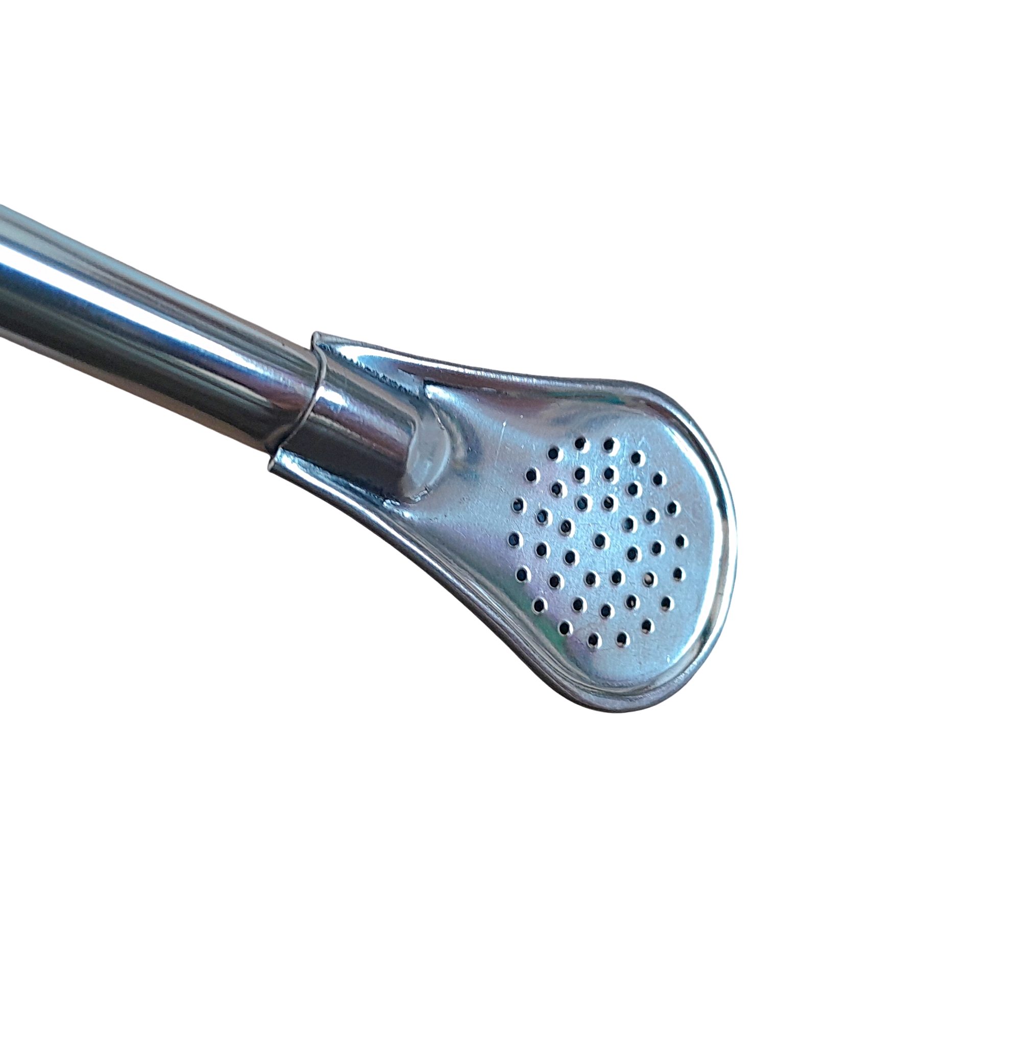 Most straws (bombilla) are made either of metal, bamboo or cane. These bombillas or straws have a fine filter at the rear end (small holes). This is the side of the bombilla / straw that is inserted into the mate. The bombilla / straw works like a tea bag for regular tea, as it keeps any fibrous material from being mixed with the liquid that you suck when using it.