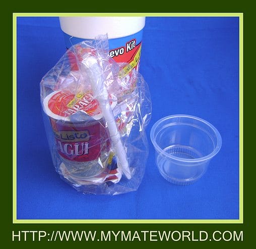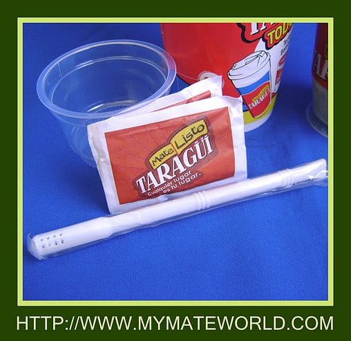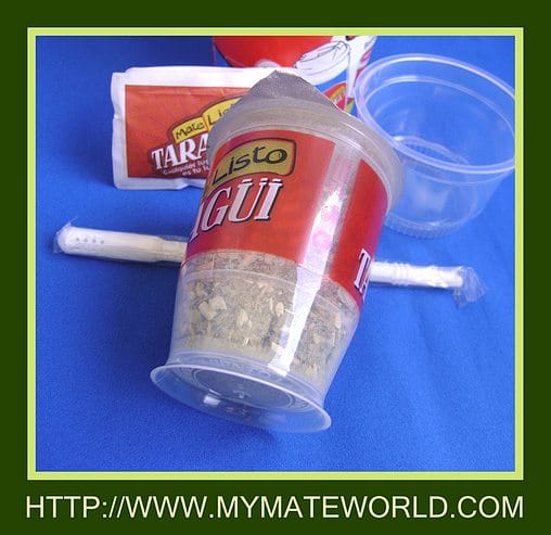 Taragui All-In-One Ready Mate comes with an insulated plastic cup containing 35 Grams of yerba mate, a plastic sipping straw and sugar (2 small bags 6.25 grams each). It also includes an additional small plastic cup you can use as a cooler in case the water you get is too hot. All you need is warm water to start enjoying great mate!.